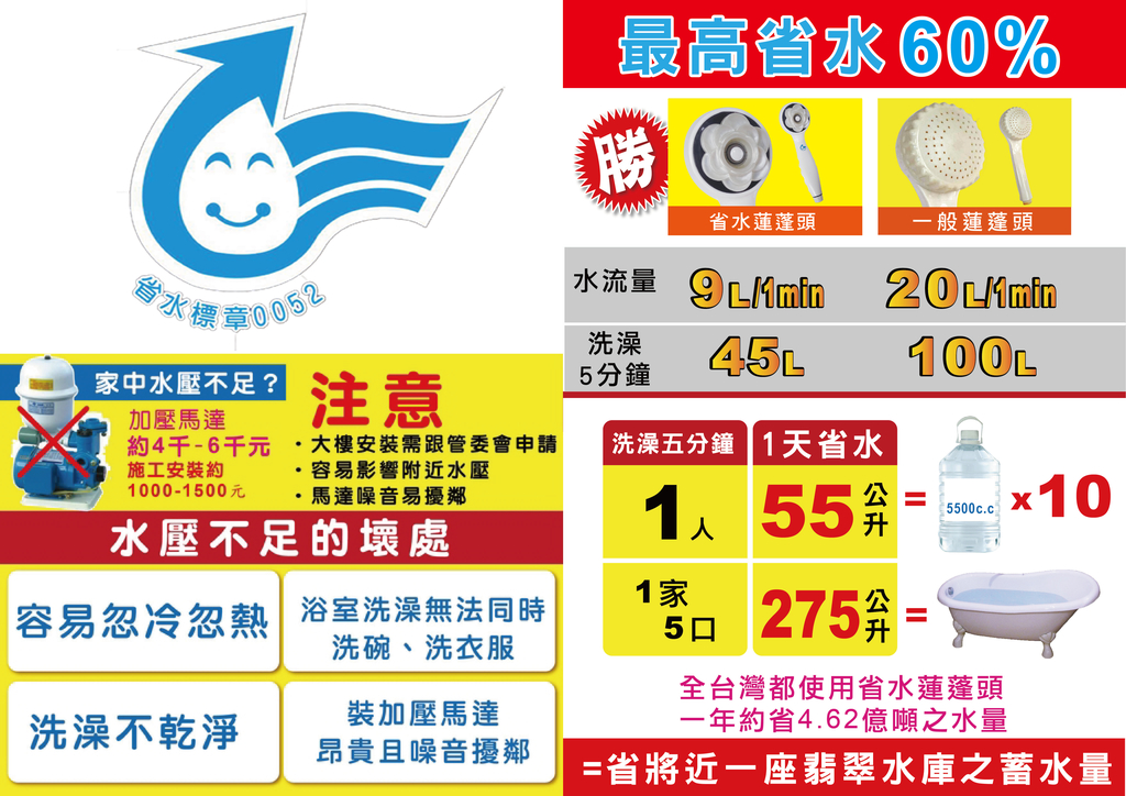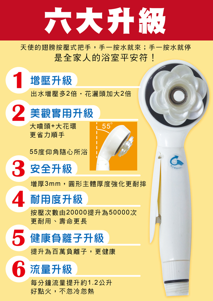 注意事項 (1)適用一般瓦斯熱水器、儲熱式熱水器、太陽能熱水器,但裝設室內用即熱式熱水器請使用BW-9S1系列,請勿使用按壓型BW-9S2,以免即熱式電熱水器因感應不良所產生之危險! (2)本產品之集中加壓功能,是將水量集中來增強水的沖力(水量不會增加),若有加裝加壓馬達,沖洗時請注意水柱強度,避免使用於眼部、臉部等易受傷部位,若水壓過強請將水量調低再沖洗! (3)為延長使用壽命及效果,沐浴後請將花型環旋轉調整至最鬆處(高出水膜式),若長期使用出水量變小,取出末端接頭濾網做清洗即可維持沖力及產品品質!