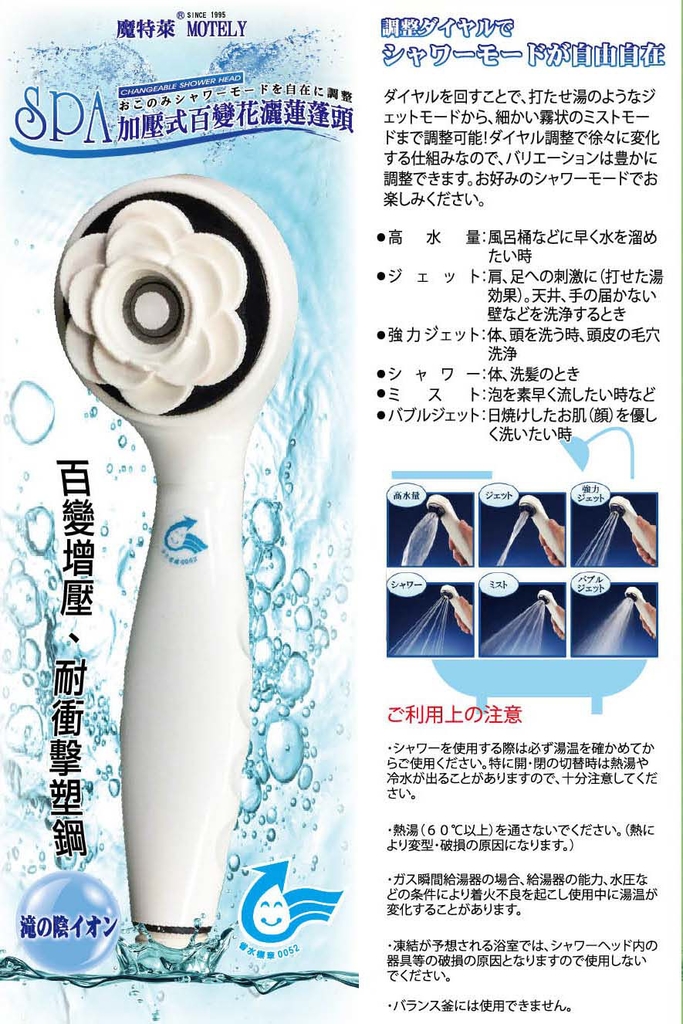 魔特萊按壓式SPA百變花灑蓮蓬頭 型號:BW-9S2尺寸:長220mm*寬67mm*高80mm 材質:ABS塑膠 顏色:白色 產地:台灣