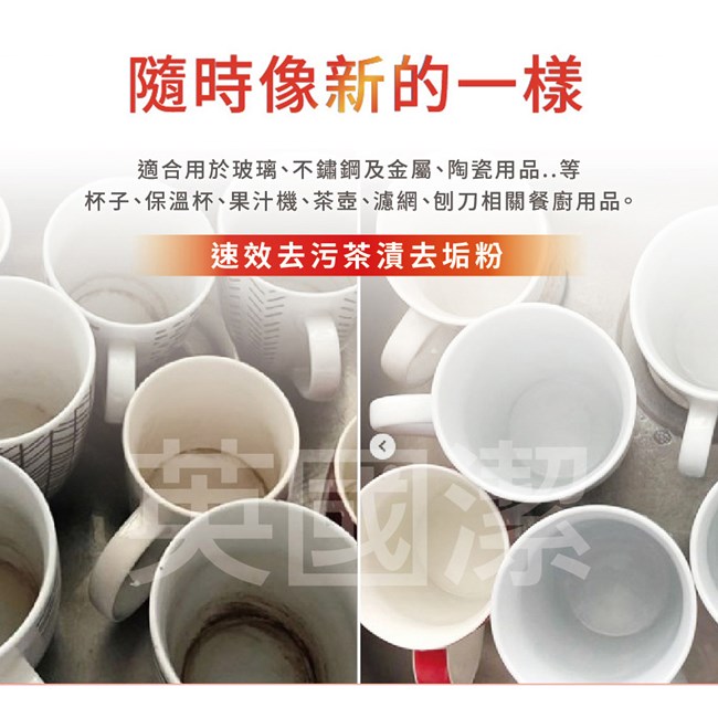 取1茶匙與欲清洗的器具浸泡在好熱水中約5分鐘,待茶漬或污垢浮出水面,再用清水沖洗乾淨