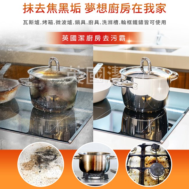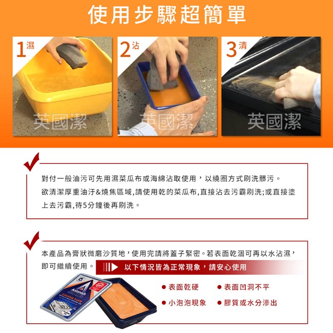 2.欲清潔厚重油污及燒焦區域,需使用乾的菜瓜布沾本產品刷洗