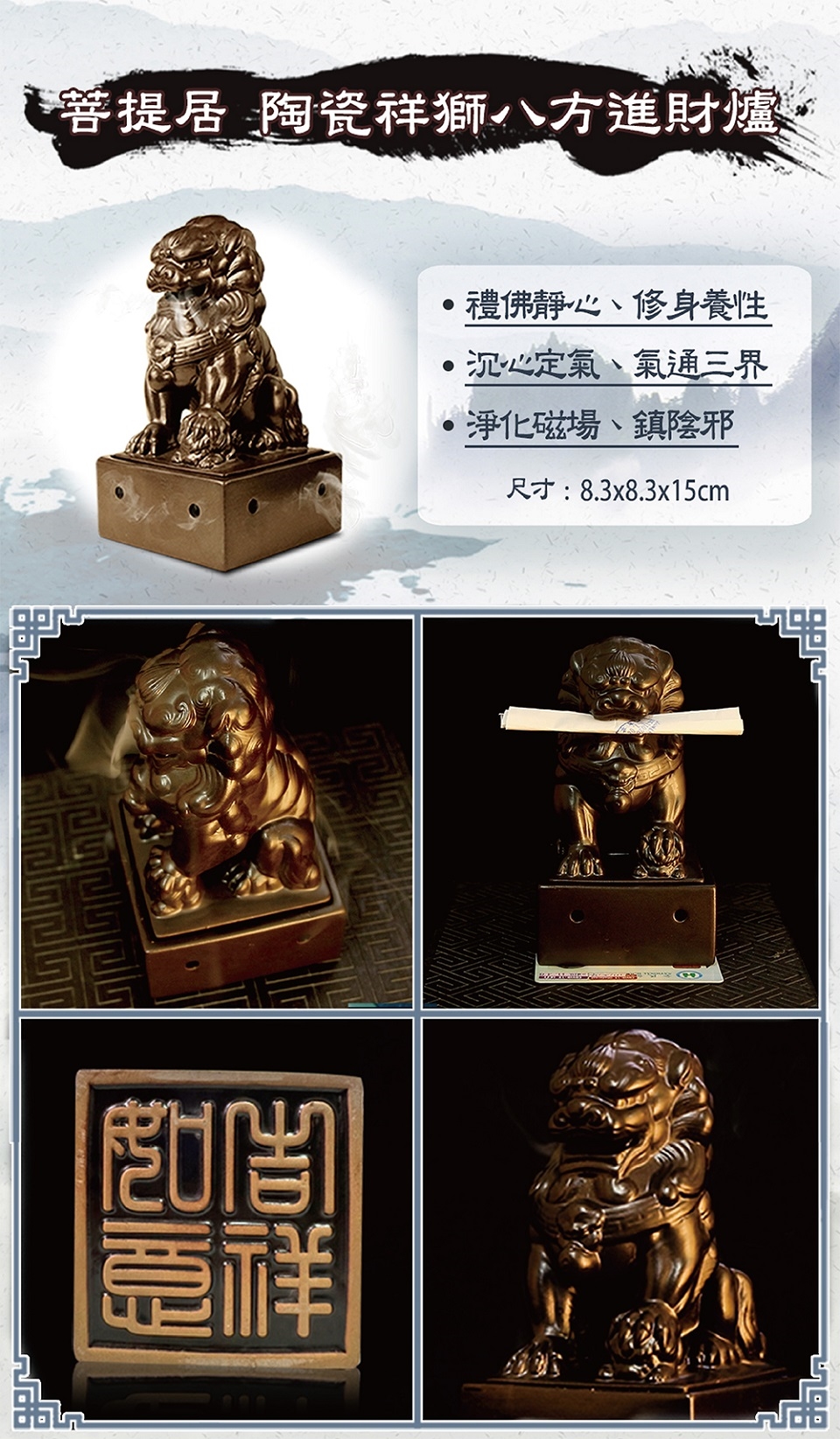尺寸:龍鬚丹手串18mm/13顆,催財烏沉香:(2g/顆,30顆/盒),陶瓷祥獅八方進財爐(約8*8*14cm)