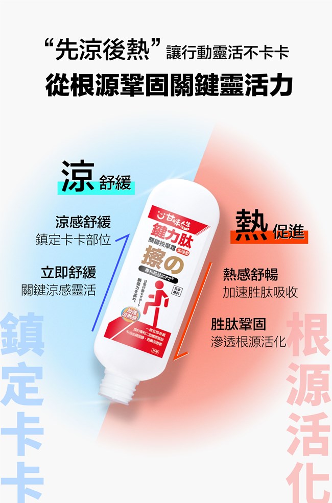 警 語:本產品含有涼熱感成分,感受程度會因個人體質狀況而異,塗抹時請避開傷口處,如有皮膚異常時,請暫停使用,外用請勿吞食。