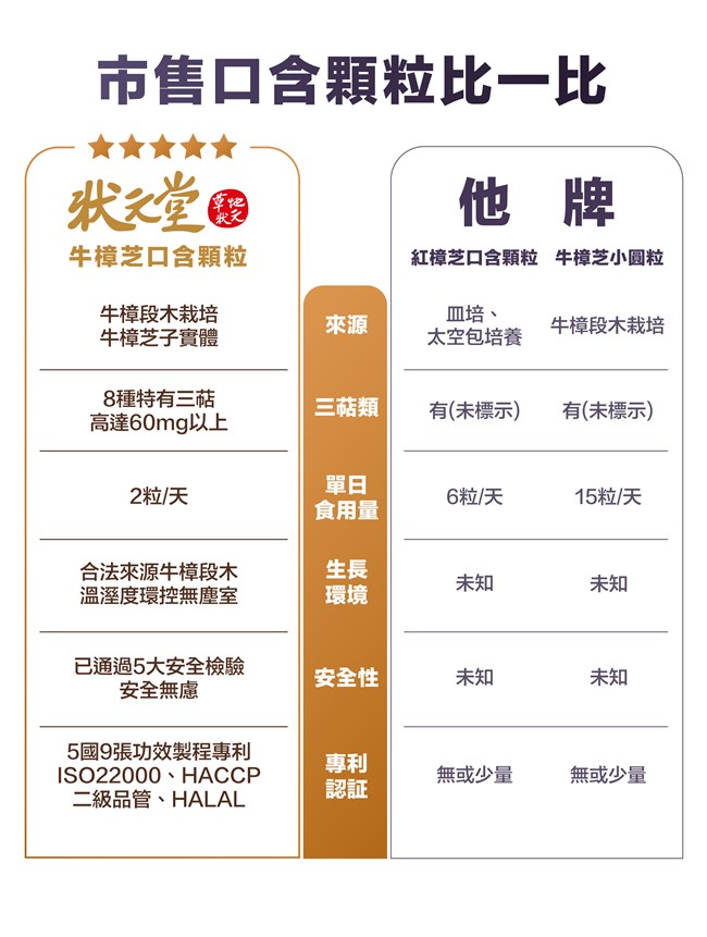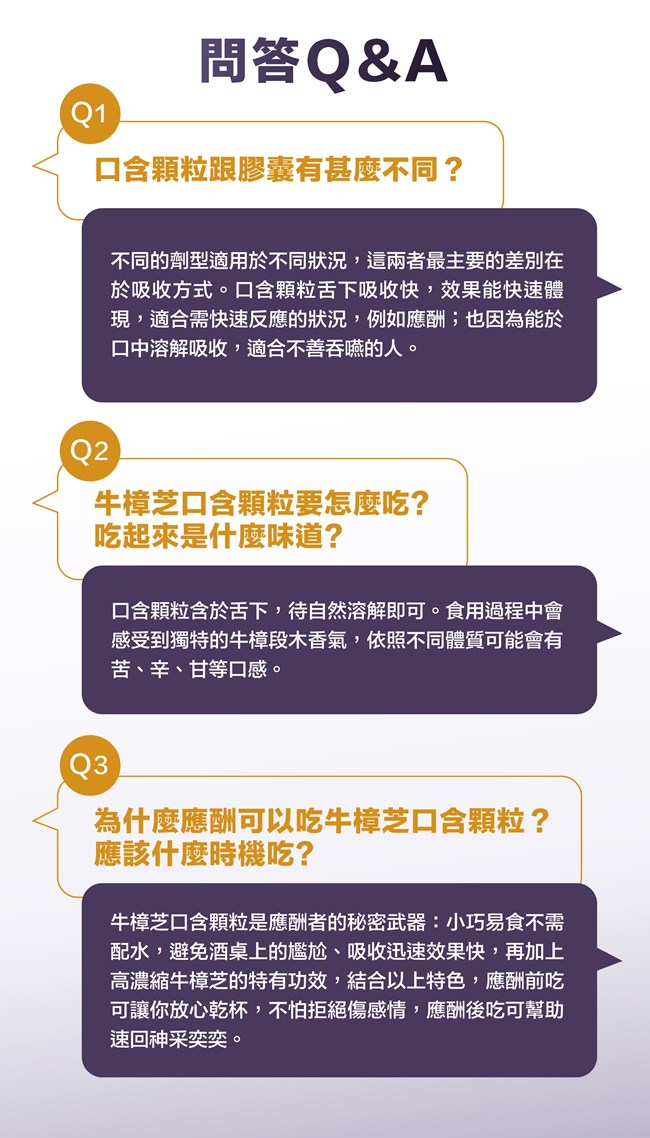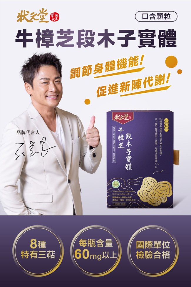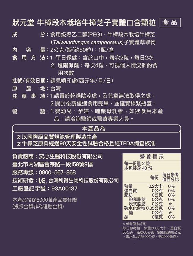 內 容 物:食用級聚乙二醇(PEG)、牛樟段木栽培牛樟芝(Taiwanofunuscamphoratus)子實體萃取物