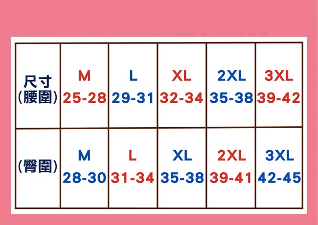 胸下圍(吋/公分) 內褲腰圍平量尺寸(吋)