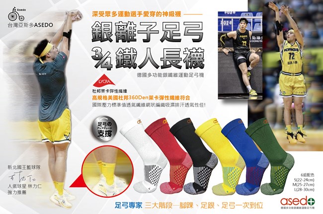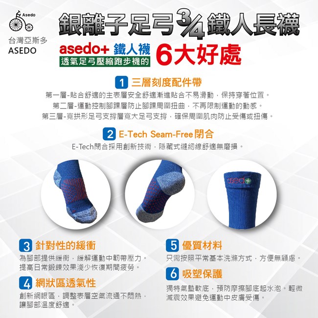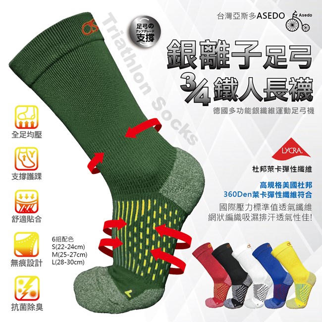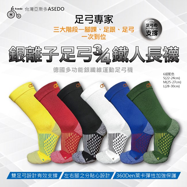 台灣亞斯多 ASEDO 銀離子足弓鐵人3/4長襪