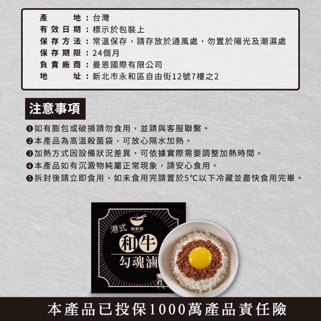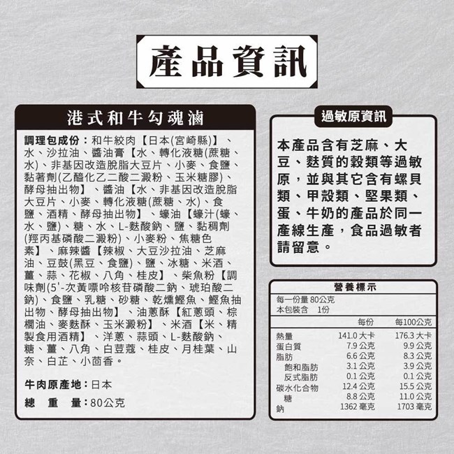 3. .內容物成分(如含有豬、牛成分請加註國別):和牛絞肉【日本(宮崎縣)】、水、沙拉油、醬油膏【水、轉化液糖(蔗糖、水)、非基因改造脫脂大豆片、小麥、食鹽、黏著劑(乙醯化乙二酸二澱粉、玉米糖膠)、酵母抽出物】、醬油【水、非基因改造脫脂大豆片、小麥、轉化液糖(蔗糖、水)、食鹽、酒精、酵母抽出物】、蠔油【蠔汁(蠔、水、鹽)、糖、水、L-麩酸鈉、鹽、黏稠劑(羥丙基磷酸二澱粉)、小麥粉、焦糖色素】、麻辣醬【辣椒、大豆沙拉油、芝麻油、豆鼓(黑豆、食鹽)、鹽、冰糖、米酒、薑、蒜、花椒、八角、桂皮】、柴魚粉【調味劑(5’-次黃嘌呤核苷磷酸二鈉、琥珀酸二鈉)、食鹽、乳糖、砂糖、乾燻鰹魚、鰹魚抽出物、酵母抽出物】、油蔥酥【紅蔥頭、棕櫚油、麥麩酥、玉米澱粉】、米酒【米、精製食用酒精】、洋蔥、蒜頭、L-麩酸鈉、糖、薑、八角、白荳蔻、桂皮、月桂葉、山奈、白芷、小茴香。