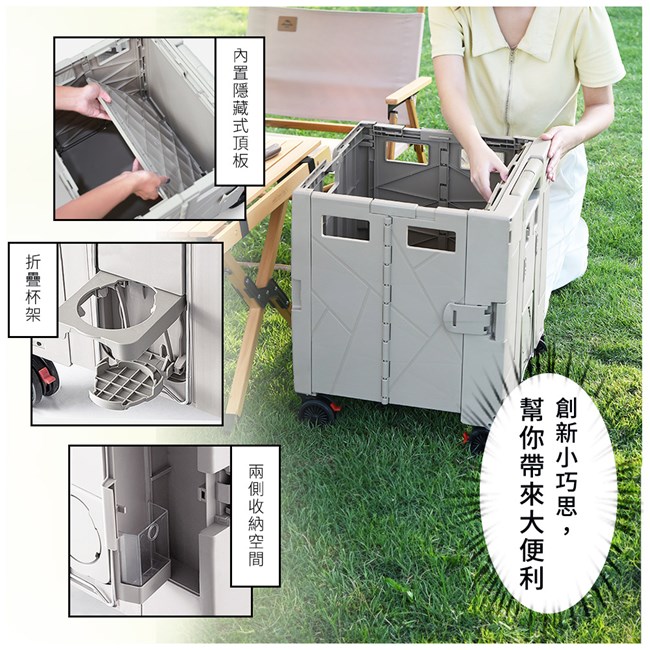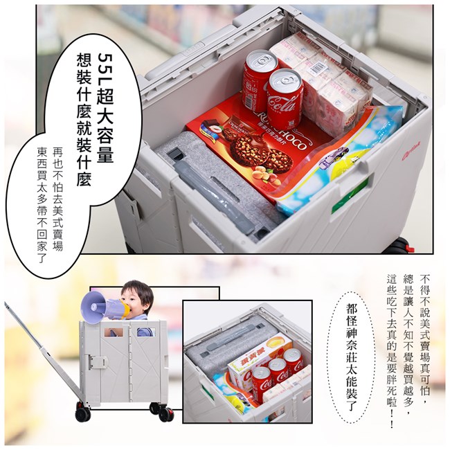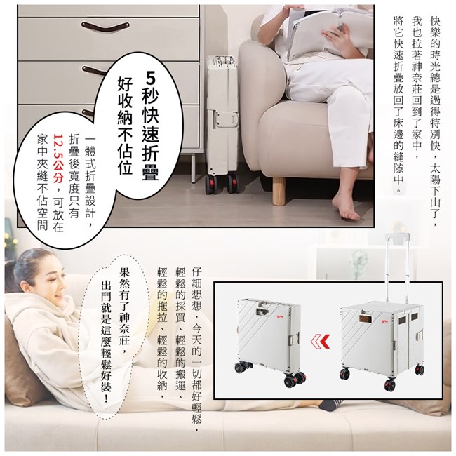 ● 5秒快速折疊收納手推車,折起來時寬度只有12.5公分,可放在家中夾縫不占空間