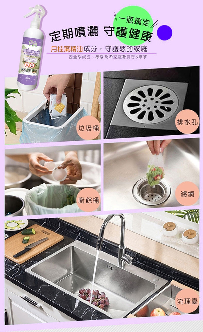 可噴灑於流理台、出水口、廚餘桶、垃圾桶、門窗
