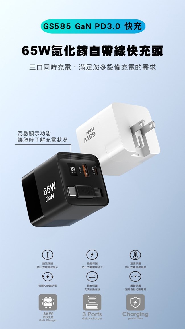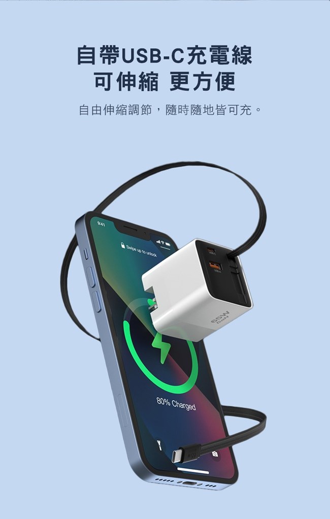 【G SAIL】65w 1A+2C 氮化鎵三孔快充 自帶1C伸縮充電線-美
