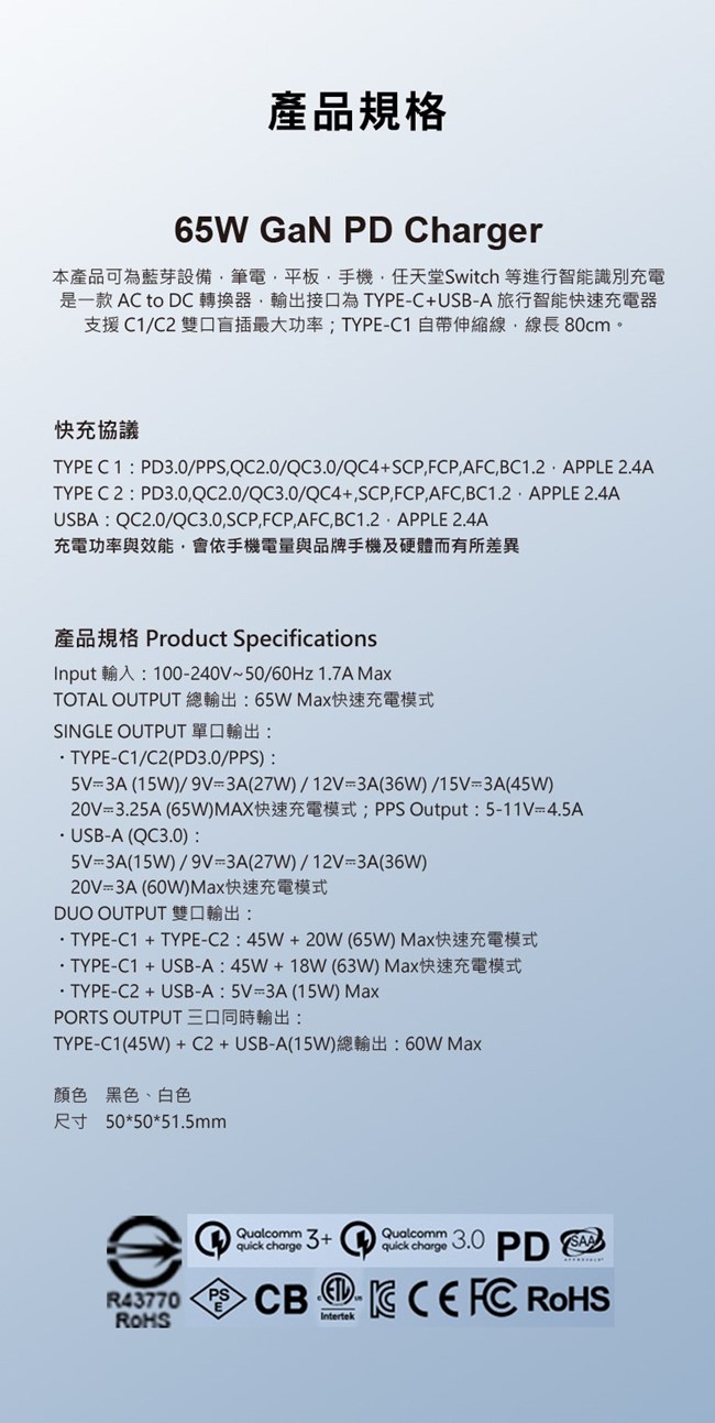 TOTAL OUTPUT 總輸出:65W Max快速充電模式