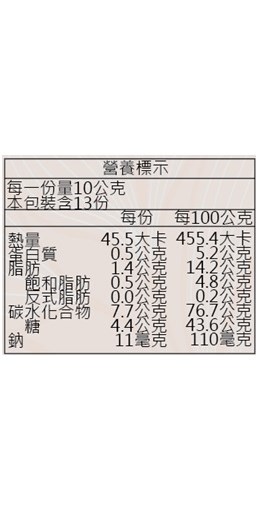 成份/Ingredients:麥芽糖(樹薯澱粉、水)、鳳梨果乾(鳳梨、糖、鹽)、乳清粉、杏仁果、砂糖、金桔果乾(金桔、麥芽)、無鹽奶油(巴氏殺菌奶油(乳脂肪82%、水分最多16%、非脂肪乳固形物最多2%)、乳酸菌)、夏威夷豆、蛋白、海藻糖、岩鹽。