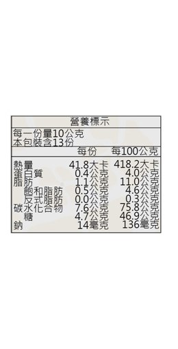 成份/Ingredients:麥芽糖(樹薯澱粉、水)、花生、乳清粉、無鹽奶油(巴氏殺菌奶油(乳脂肪82%、水分最多16%、非脂肪乳固形物最多2%)、乳酸菌)、砂糖、蛋白、海藻糖、岩鹽。