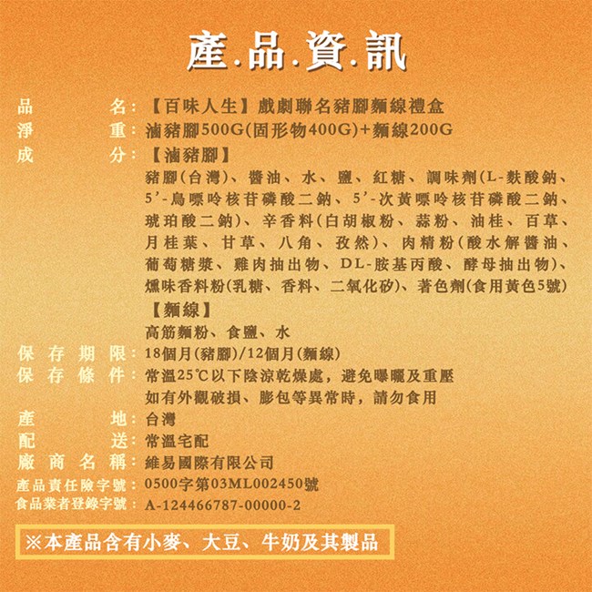 【 百味人生】戲劇聯名豬腳麵線限量禮盒(滷豬腳500g+麵線200g) - 屠宰衛生檢查合格章/ 食品追溯追蹤系統制度(一Q)