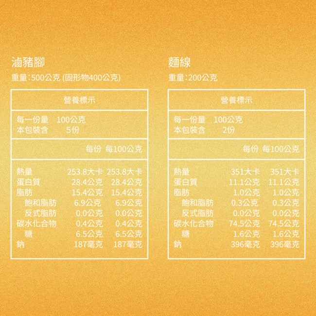 重量:滷豬腳500g(固形物400g)+麵線200g