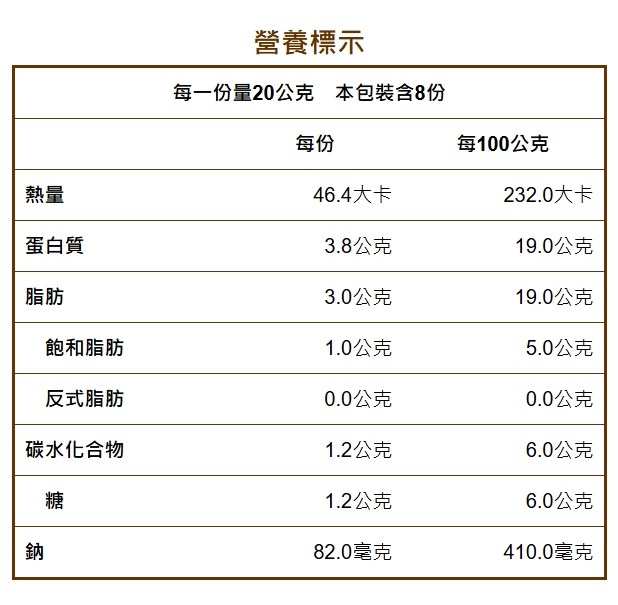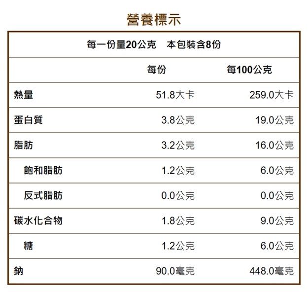 內容物:鵪鶉蛋、糖、釀造醬油(非基因改造黃豆及小麥製品)、焦糖色素(著色劑)、香辛料(肉桂、花椒)