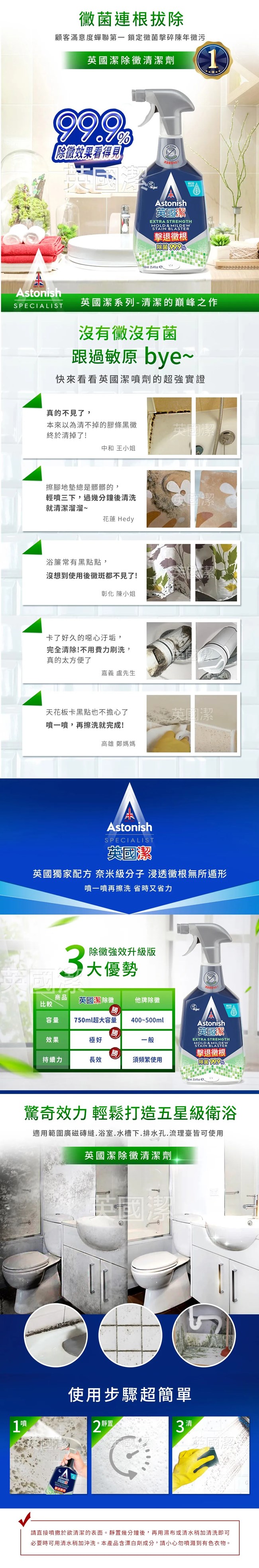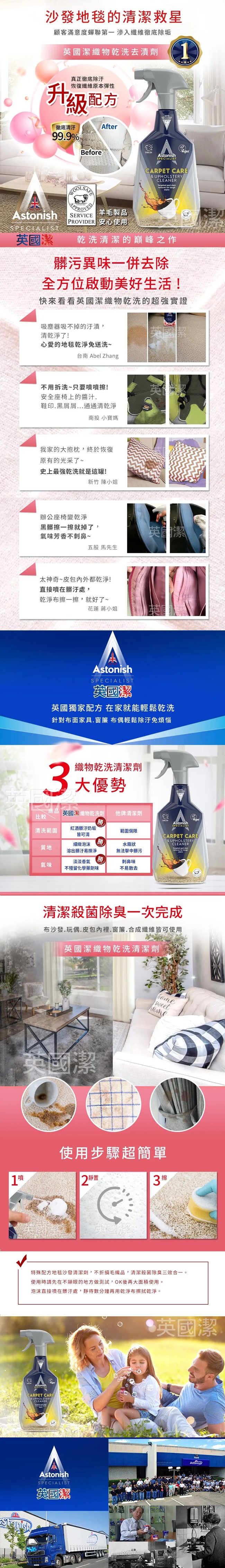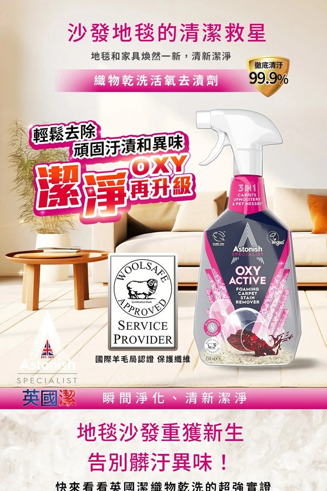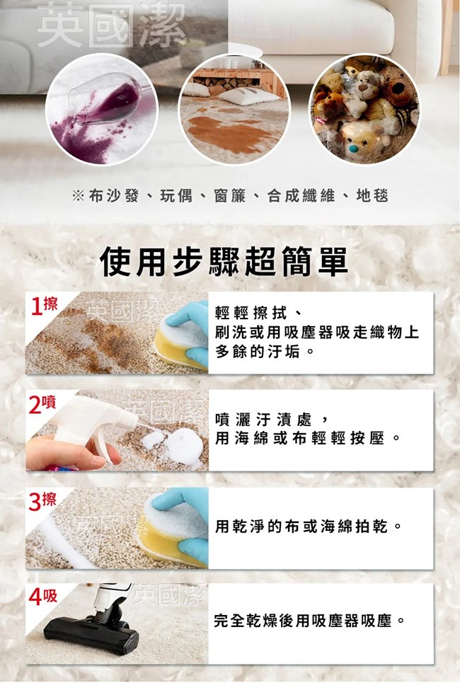★地毯沙發織物乾洗去汙劑:迅速解決地毯 沙發髒污✓ 已稀釋的地毯沙發清潔劑,不折損毛織品✓ 適用於地毯、室內裝潢品和汽車座椅,亦可用於天然和合成纖維上✓ 清除汙垢,中和難聞異味✓ 適用於地毯、窗簾、沙發、汽車座墊✓ WoolSafe 認證★瞬效除黴去汙清潔劑深入黴根~快速打擊汙垢.獨家除菌成分,強效深入霉根.輕鬆噴灑,免刷洗科技.活性配方有助於防止黴菌的復發.適用在牆壁、uPVC 窗框、玻璃、塑膠浴簾、浴室瓷磚、灌漿、矽力康、混凝土、水槽和塞孔上使用。 ※適用於無孔硬質表面、破損表面請勿使用。.完全可回收的瓶子,零殘忍,純素且可生物降解。