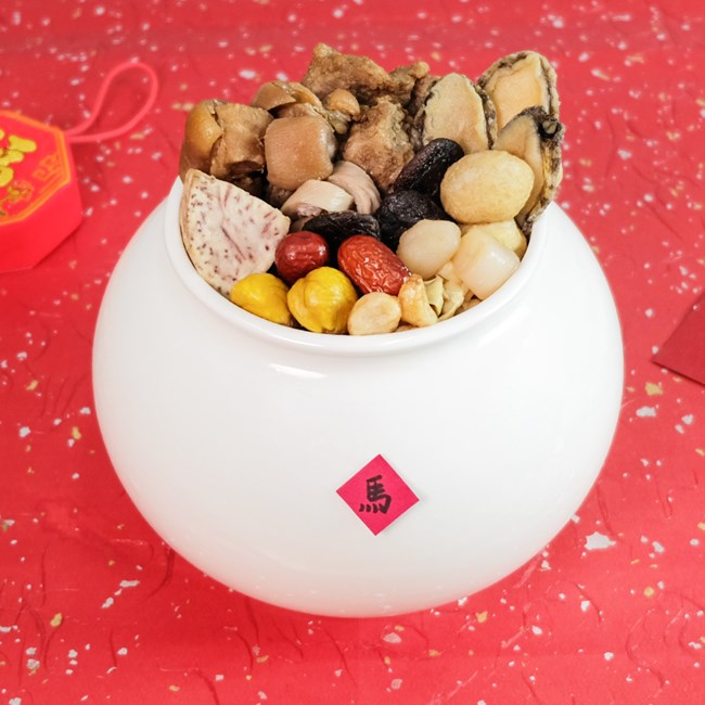 成份:水、芋頭、排骨酥【豬排骨(台灣)、大豆分離蛋白(基因改造)、蕃薯粉、糖、食鹽、醬油、麥芽糊精、乾酪素鈉、多磷酸鈉、焦磷酸鈉(無水)、L-麩酸鈉、DL-胺基丙酸、5ˊ-次黃嘌呤核苷磷酸二鈉、5ˊ-鳥嘌呤核苷磷酸二鈉、琥珀酸二鈉、香辛料(肉桂、小茴、大茴、丁香、甘草)、肉桂香料[酵母精粉、乳糖、食鹽、植物水解蛋白(大豆(基因改造)、玉米、小麥)〕、胺基乙酸、精製芥花油、砂糖、棕櫚油、豬肉抽出物、洋蔥粉、葡萄糖、香料、D-木糖、二氧化矽、乙基麥芽醇、甘草素(甜味劑)、檸檬酸鈉】、豬腳丁(美國)、筍乾【竹筍、鹽、水、苯甲酸0.1%以下(防腐劑)、亞硫酸鈉(漂白劑)】、鳥蛋、鮑魚【鮮鮑魚】、豬肚(法國)、金蘭醬油、二砂、大骨高湯粉【鹽、調味劑 (L-麩酸鈉、胺基乙酸、琥珀酸二鈉、5´-次黃嘌呤核苷磷酸二鈉、5´-鳥嘌呤核苷磷酸二鈉)、麥芽糊精、糖、豬肉粉〔乳糖、醬油粉、植物水解蛋白(大豆、玉米、小麥)、DL-胺基丙酸、精製芥花油、豬肉抽出物、葡萄糖、D-木糖〕、洋蔥粉、品質改良劑(二氧化矽)、香料、甘草、薑母、當歸(調味用)、白胡椒】、馬鈴薯澱粉、偽魚翅【食用海藻膠、食用明膠、黃梔子色素、水】、烏醋、栗子、香菇、蒜仁、珠貝、紅棗、魚皮、鹽、香油【芝麻油、大豆油】。