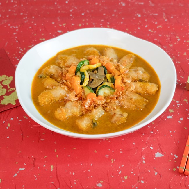 將蔬菜包放在盤內四周、再將魚塊放置於盤子中心,後淋上紅咖哩醬撒上櫻花蝦即可。