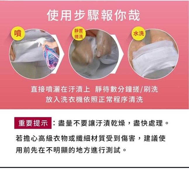 ※含有氧漂白劑,使用前請參閱服裝洗標說明。如果不確定,在較不顯眼的角落先進行顏色相容性測試,再進行廣泛使用。※避免接觸金屬或木材,包括服裝扣件。※請勿在防水或阻燃織物上使用。※請勿用於乾洗織物或羊毛、絲綢、絨面或皮革等精緻織物。※洗滌前避免將經過處理的衣物暴露在直接熱源或陽光下。噴灑本產品後,請在乾燥前洗滌。※請勿與含氯漂白劑混合使用。
