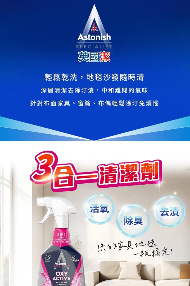 ▲英國潔Astonish地毯沙發織物乾洗去汙劑