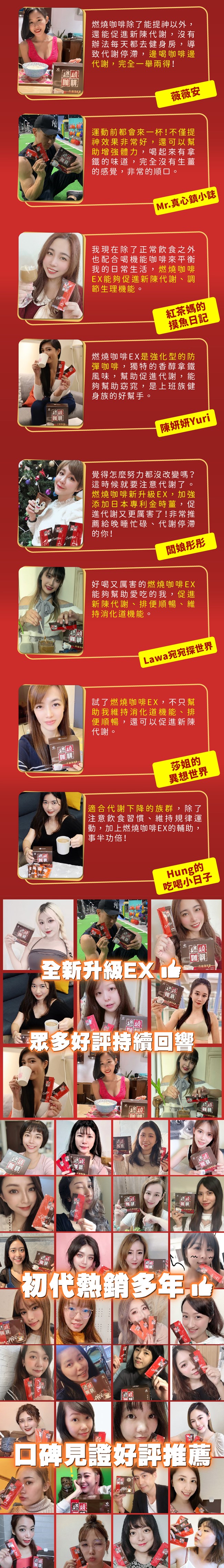 奶精(玉米糖漿、完全氫化椰子油、乾酪素鈉、乳清粉、磷酸氫二鉀、多磷酸鉀、脂肪酸甘油酯、乳酸硬脂酸鈉、二氧化矽、香料、婀娜多色素、薑黃色素)、黑咖啡粉、菊糖(菊苣纖維)、麥芽糊精、綠咖啡萃取物(含綠原酸)、辣椒萃取物、發酵黑生薑、綜合胺基酸(鹽酸L-二胺基己酸、L-精胺酸、L-白胺酸、L-苯丙胺酸、L-⍺胺基異戊酸、L-異白胺酸、L-羥丁胺酸、L-麩胺酸、L-組胺酸、L-色胺酸)、金時薑粉末、中鏈脂肪酸甘油酯粉(中鏈三酸甘油酯、麥芽糊精、麥芽糖漿、酪蛋白鈉、脂肪酸甘油酯、二氧化矽、多磷酸鈉、混合濃縮生育醇)。