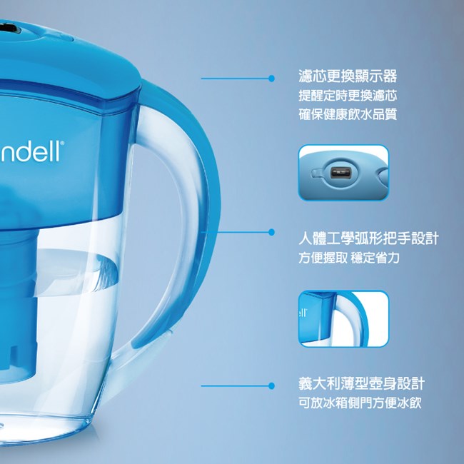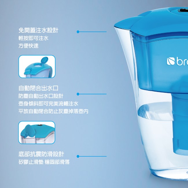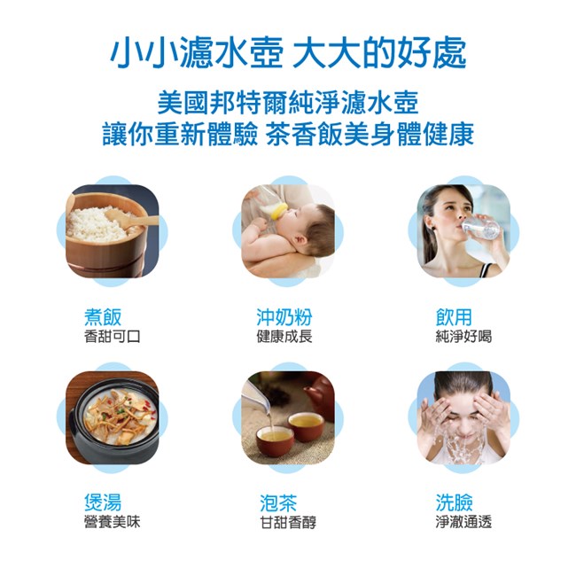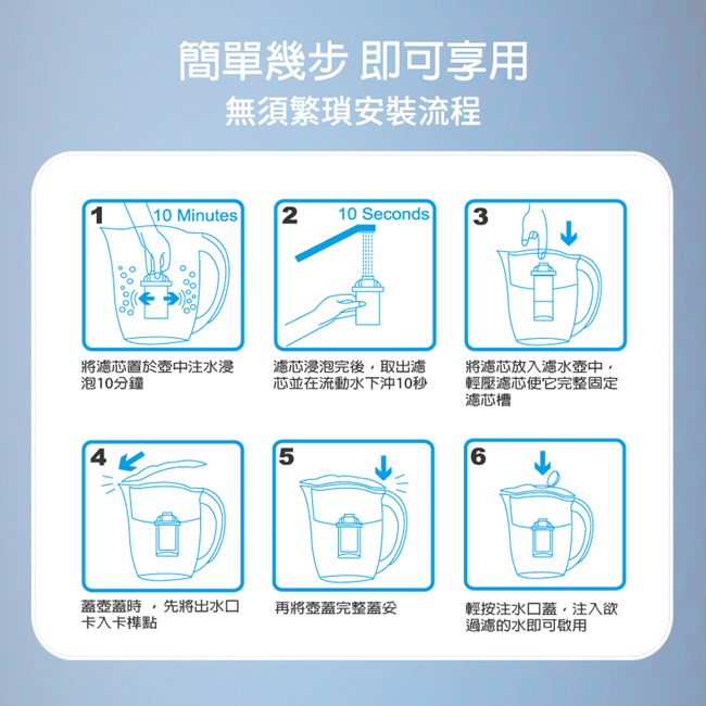 使用方法:首次使用請打開濾水壺上蓋,將濾芯置入壺中注水浸泡10分鐘後,再將濾芯取出以流動水沖洗10秒,再置入濾水壺中,即可開始使用。