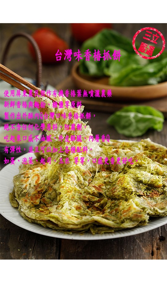 蔥抓餅: 每一份量138公克 熱量515.2大卡 蛋白質8.0公克 脂肪29.4克 飽和脂肪12.9公克 反式脂肪 0.0公克 碳水化合物54.6公克 糖1.7公克 鈉633毫克 香椿抓餅:每一份量138公克 熱量437.5大卡 蛋白質 10.5公克 脂肪16.8克 飽和脂肪3.9公克 反式脂肪 0.0公克 碳水化合物59.6公克 糖2.2公克 鈉678毫克