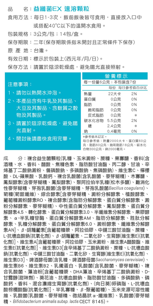 複合益生菌顆粒(乳糖、玉米澱粉、蔗糖、果寡醣、香料(含酒精、水、香料、醋酸、焦糖色素、脂肪酸甘油酯、丙二醇、甘油、辛烯基丁二酸鈉澱粉、偏磷酸鈉、多磷酸鈉、焦磷酸鈉)、維生素C、檸檬酸、DL-蘋果酸、乳酸鈣、複合乳酸菌(含乳酸菌、麥芽糊精)、木寡醣、鳳梨酵素(含麥芽糊精、鳳梨酵素)、聚阿拉伯半乳糖(松木多醣)、難消化性麥芽糊精、芽孢乳酸菌(含麥芽糊精、芽孢乳酸菌Bacillus coagulans)、菊糖(菊苣纖維)、綜合酵素[含麥芽糊精、澱粉分解酵素、植酸酵素、葡萄糖澱粉酵素RO、複合酵素(含脂肪分解酵素、蛋白質分解酵素、澱粉分解酵素、麥芽糊精)、中性蛋白質分解酵素、鳳梨酵素、蛋白質分解酵素4.5、轉化酵素、蛋白質分解酵素3.0、半纖維素分解酵素、果膠酵素、α-半乳糖苷酶、蛋白質分解酵素AM、脂肪分解酵素、胜肽分解酵素、乳糖分解酵素、蛋白質分解酵素6.0、澱粉酵素、纖維素分解酵素AN]、β-胡蘿蔔素[含葡萄糖漿、阿拉伯膠、中鏈三酸甘油酯、蔗糖、L-抗壞血酸鈉(抗氧化劑)、β-胡蘿蔔素、二氧化矽、生育醇(維生素E)(抗氧化劑)]、維生素A[含葡萄糖漿、阿拉伯膠、玉米澱粉、維生素A醋酸酯、維生素E(抗氧化劑)]、維生素D3[含辛烯基丁二酸鈉澱粉、蔗糖、L-抗壞血酸鈉(抗氧化劑)、中鏈三酸甘油酯、二氧化矽、生育醇(維生素E)(抗氧化劑)、維生素D3]、啤酒酵母菌(含乳糖、啤酒酵母菌Saccharomyces cerevisiae)、維生素B6、維生素B2、乳鐵蛋白、乳酸菌(含乳酸菌、麥芽糊精)、複合乳酸菌、藻油粉[含葡萄糖漿、DHA藻油、辛烯基丁二酸鈉澱粉、D-甘露醇(甜味劑)、葵花油、抗壞血酸鈉、脂肪酸甘油酯、多磷酸鈉、磷酸鈣、香料、混合濃縮生育醇(抗氧化劑)、(向日葵)卵磷脂、L-抗壞血酸棕櫚酸酯(抗氧化劑)]、半乳寡糖、β-聚葡萄糖)、玉米來源可溶性纖維、乳酸菌(乳酸菌、麥芽糊精、微結晶狀α-纖維素)、乳酸菌(麥芽糊精、Bifidobacterium animalis subsp. lactis CECT 8145)