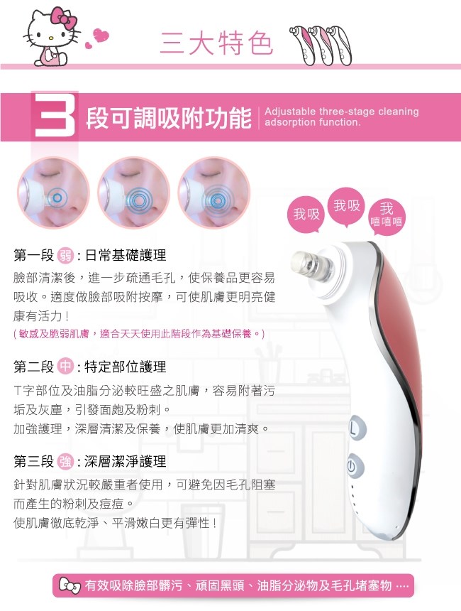 三麗鷗授權,全球第一支Kitty版毛孔潔淨儀!毛孔潔淨 =皮膚健康;從年輕時就該培養毛孔清潔概念,簡單好操作,粉刺痘痘一次清乾淨!從荳蔻年華到上班族小資女、追求時尚及粉領新貴等男女皆可~簡潔流線的設計風格加上好手感,三種顏色可選擇!專為深層毛孔清潔而設計,操作簡單、外型輕巧可愛,攜帶方便,加上舒適的手握感處理,使用起來更輕鬆。擁有可調節式三段吸附功能,可根據不同肌膚狀況選擇不同的吸附大小,有效吸出毛孔內的黑頭等汙垢,可調節油脂分泌。