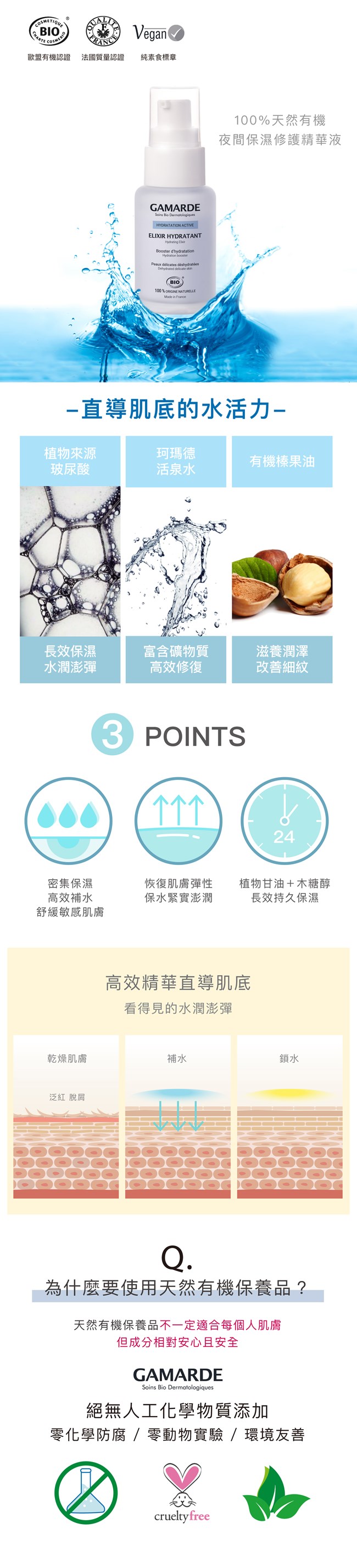 高效保濕精華,鎖水/保水/補水,含豐沛生命之源珂瑪德天然活泉水 ,及珍貴的有機摩洛哥堅果油、有機榛果油,為肌膚注入豐沛的涵水精華,有效保濕滋養肌膚水活力,呵護肌膚 ,讓肌膚獲得修護、滋養,重拾柔嫩及彈力膚觸。