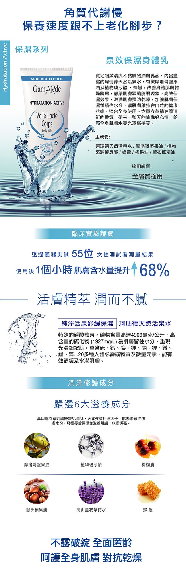 質地細緻清爽不黏膩的潤膚乳液,內含豐富的珂瑪德天然活泉水,有機摩洛哥堅果油及植物來源的透明質酸(玻尿酸) 、蜂蠟,改善身體肌膚乾燥脫屑,舒緩肌膚緊繃脆弱現象。高效保濕效果,滋潤肌膚預防乾燥,加強肌膚保濕並鎖住水分,讓肌膚維持在自然的健康狀態,適合全身使用。含薰衣草精油讓清新的香氛,帶來一整天的愉悅好心情,給您全身肌膚水亮光澤新感受。