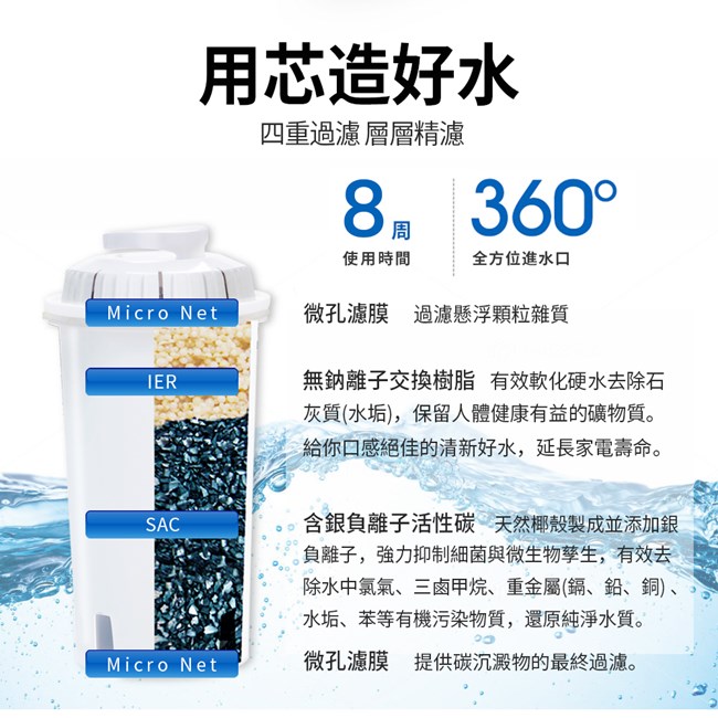 ✿ 濾材成分:天然椰子殼(SAC)銀負離子活性碳、(IER)無鈉離子交換樹脂、(MICRO NET)微孔濾膜