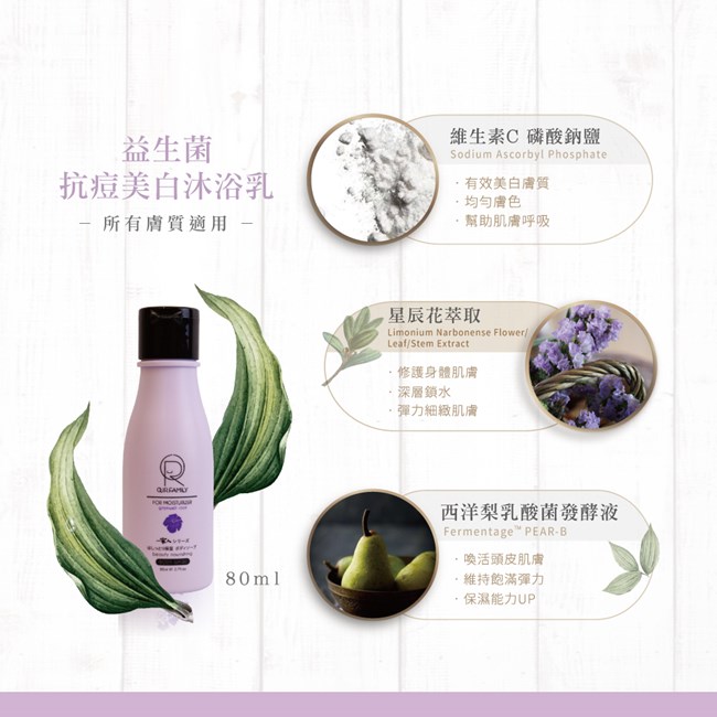 ✔ 益生菌添加:為肌膚增加好菌,維持肌膚健康生態環境