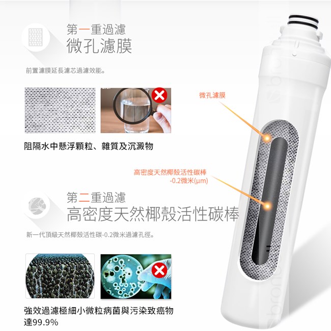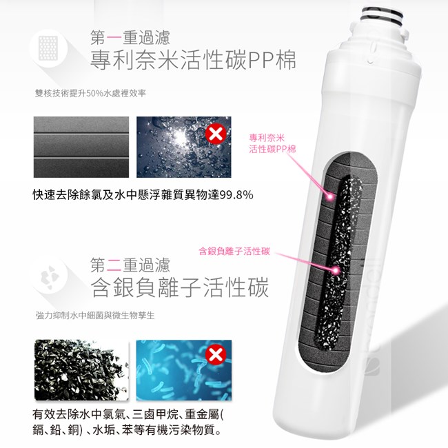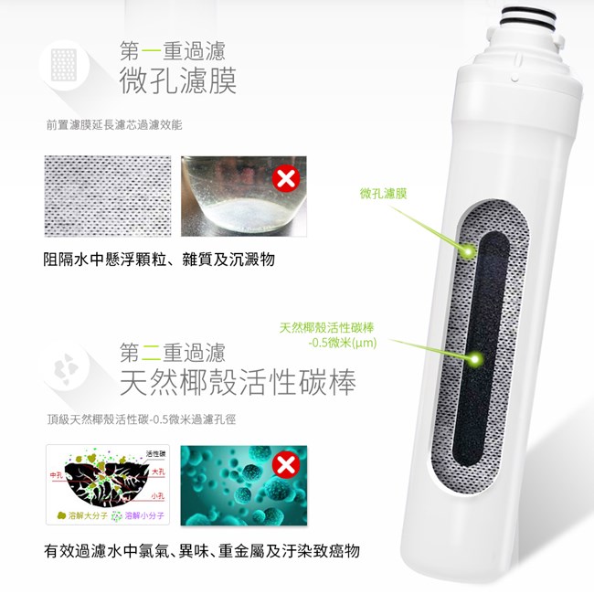 . 功效:增加口感並有效去除水中氯氣、異味及0.5微米(μm)以上雜質達99.8%