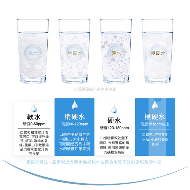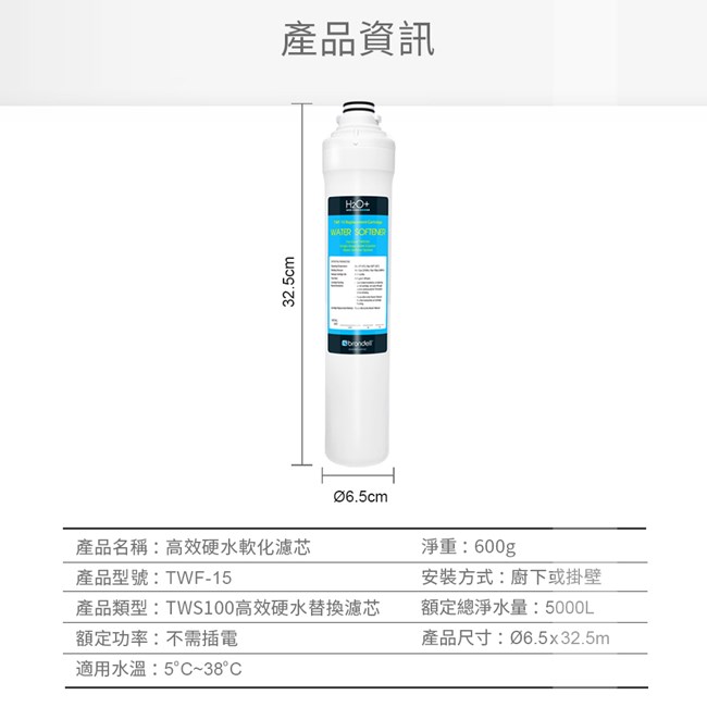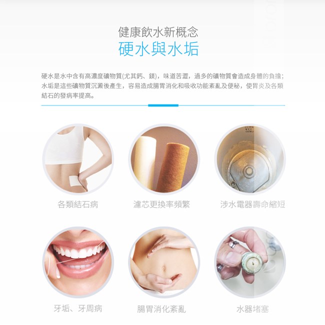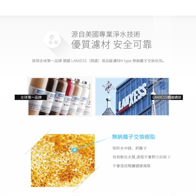 . 功效:強效去除水中石灰質(鈣鎂離子),軟化水質防止水垢產生、口感提升