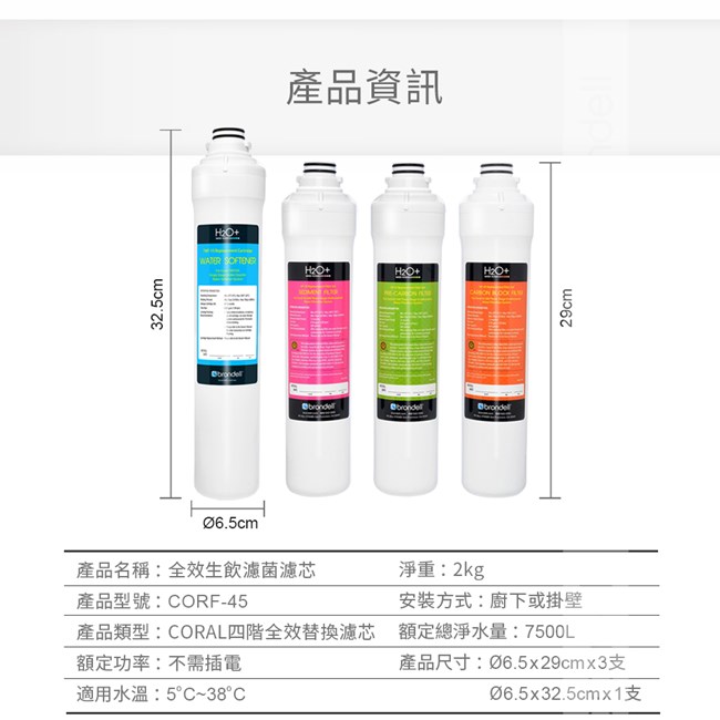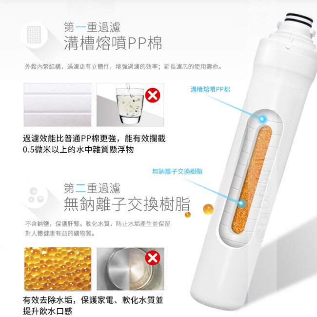 . 功效:強效去除水中石灰質(鈣鎂離子),軟化水質防止水垢產生、口感提升