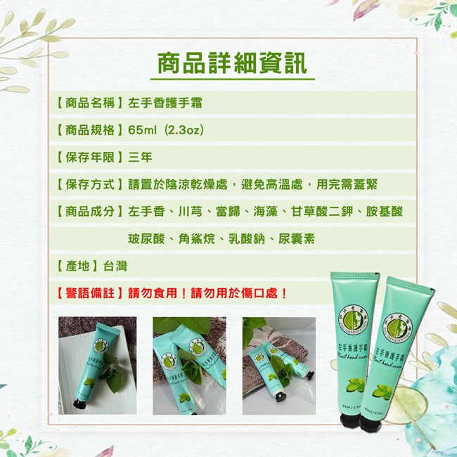 【商品成分】左手香、川芎、當歸、海藻等萃取液、甘草酸二鉀、氨基酸、玻尿酸、角鯊烷、乳酸鈉、尿囊素等。