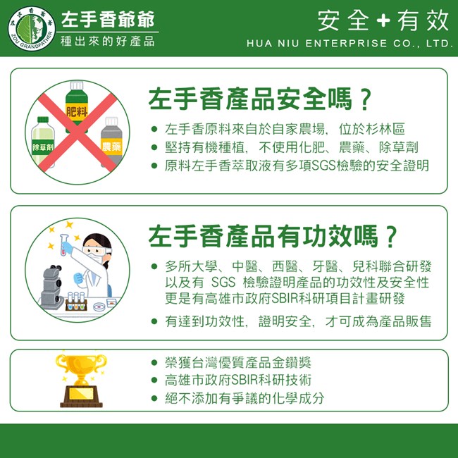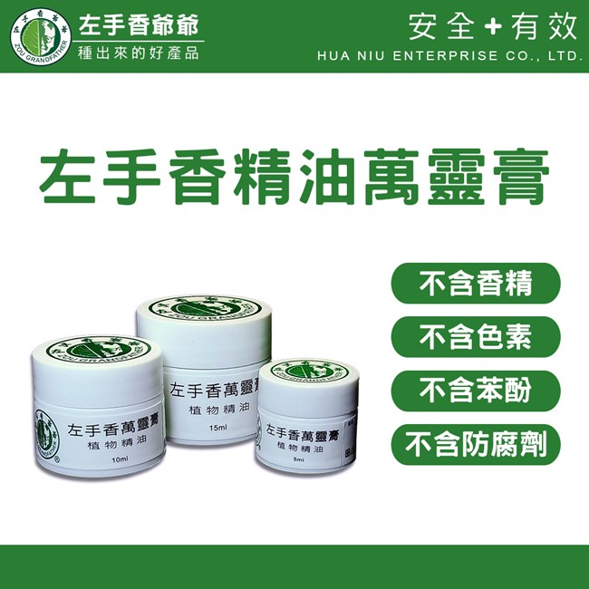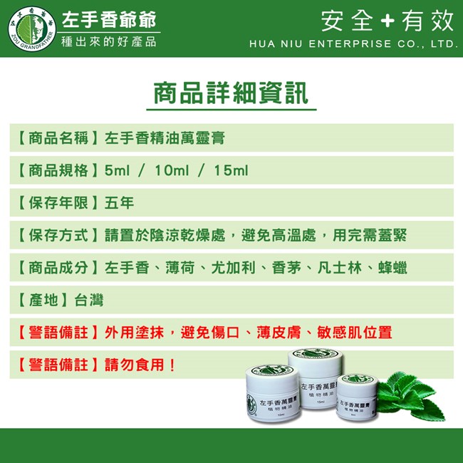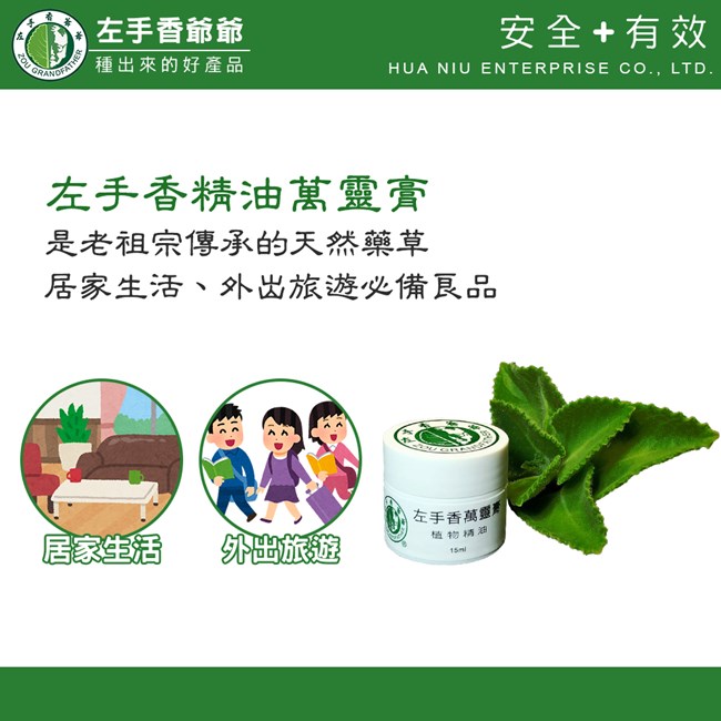 左手香爺爺在高雄市杉林區有一座農場種植左手香參考有機種植方式栽種左手香,堅持不化肥、不噴農藥、不噴除草劑運回工廠,採用萃取技術與其他精油調配出「左手香精油萬靈膏」