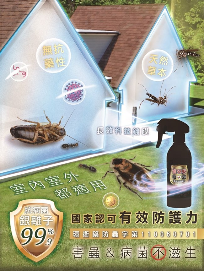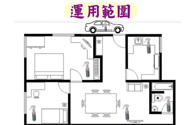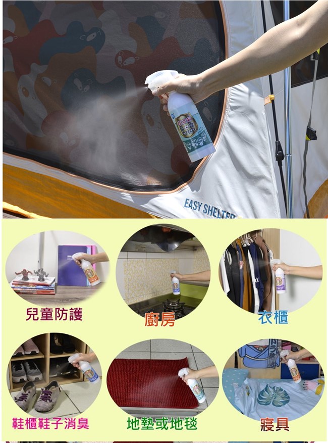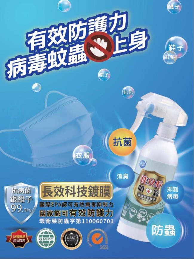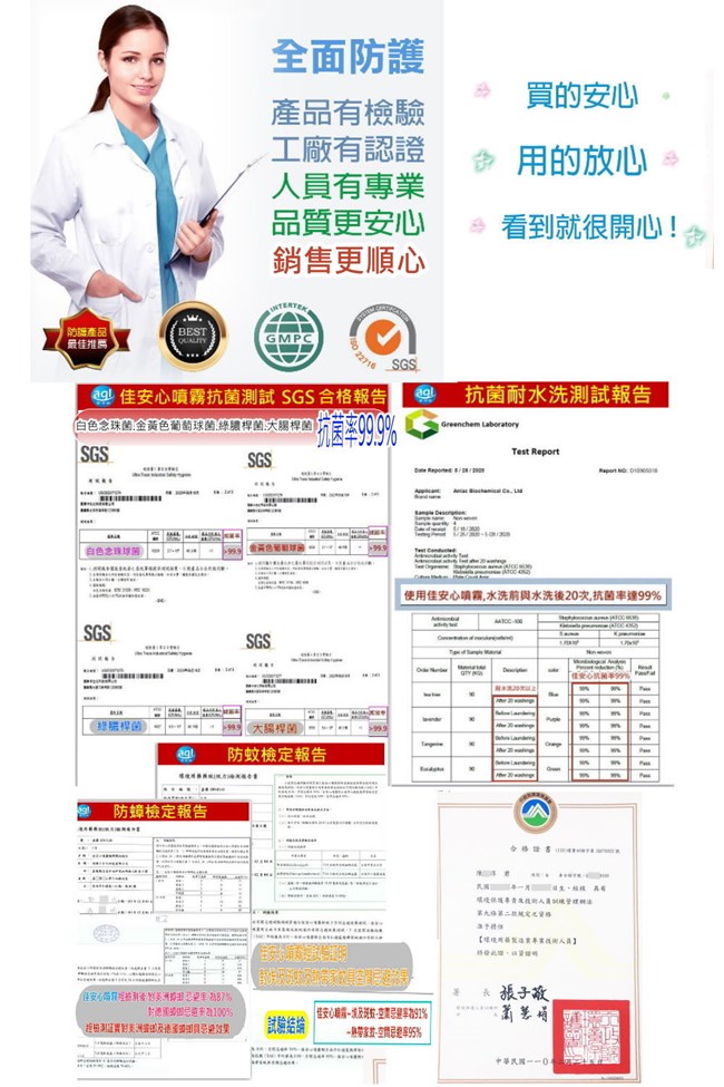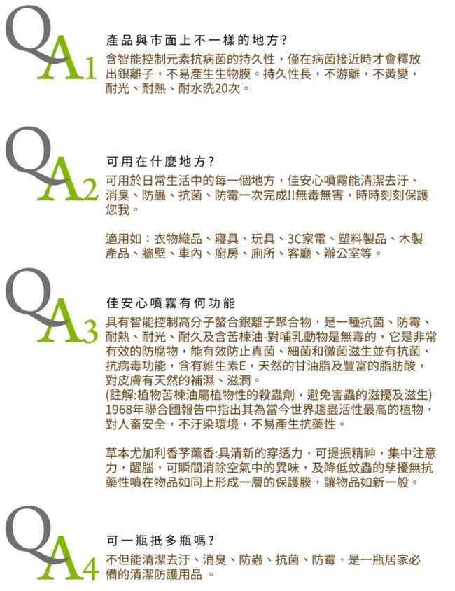 具有消臭、防蟲、抗菌、防霉、清潔去污等多效能一次完成, ,天然尤加利香茅草本清香,無毒無害,並在抗菌抑臭,技術提高長效,耐久性,耐光耐熱的智能控制抗菌機制,確保噴灑織物後可耐水洗20次的持久抗菌率99%.