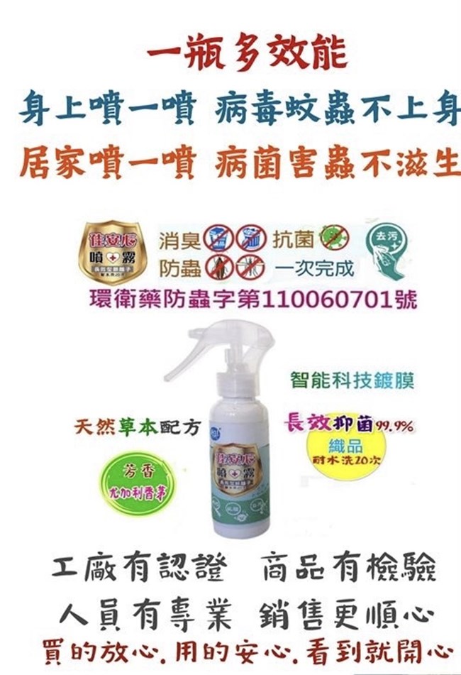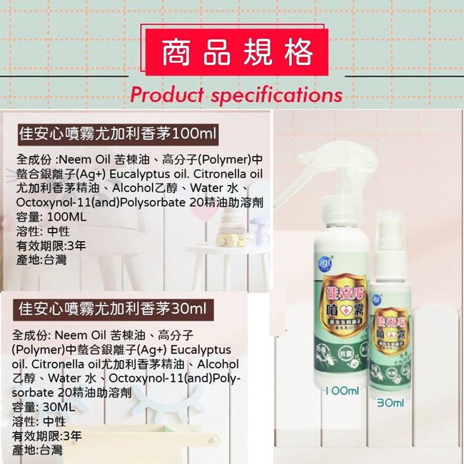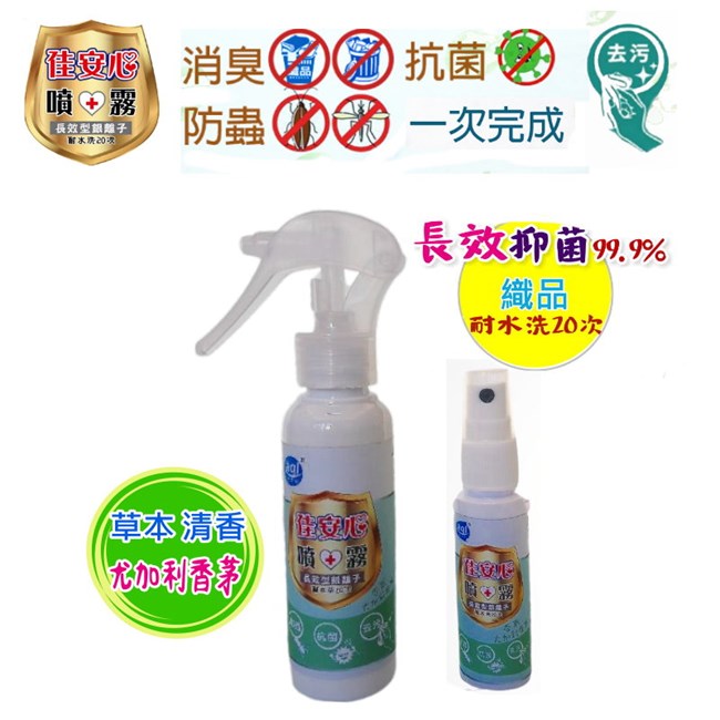 品 名:【佳安心】全面防護長效抗菌.防蟲消臭噴霧 - 尤加利香茅100ml+加贈30ml / 體驗組