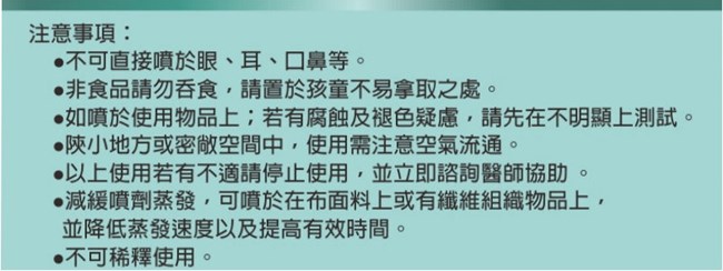 1.距肌膚10~15cm,均勻噴於四肢部位或衣物表面。