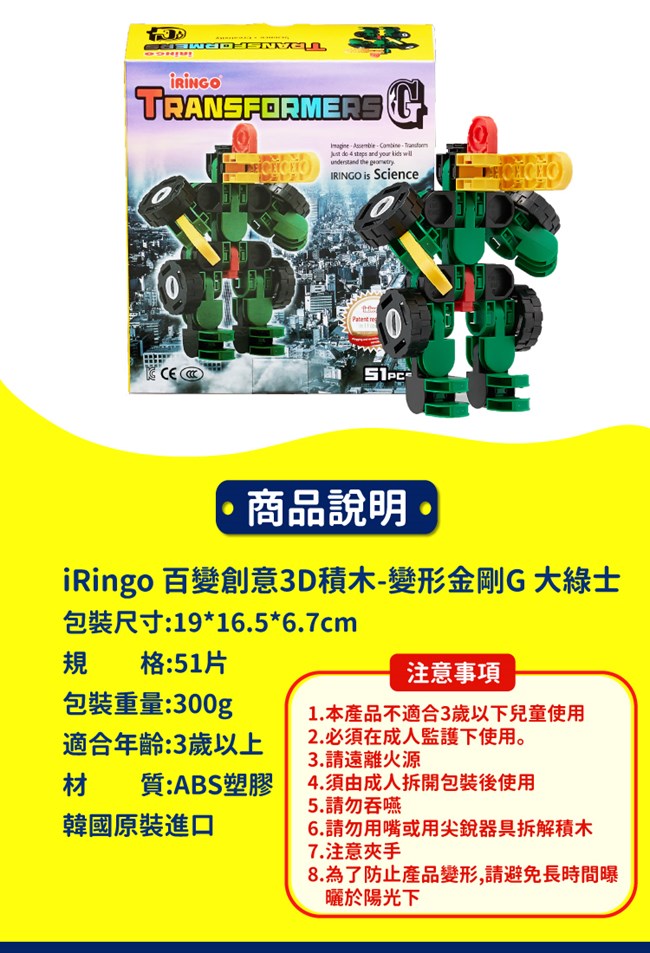 韓國iRingo 百變創意3D積木-變形金剛G-大綠士 (可變形&可旋轉)