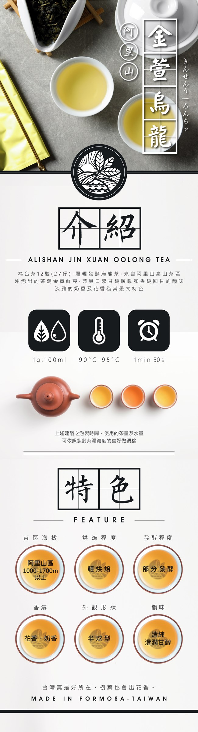 為 台 茶 1 2 號 ( 2 7 仔 ),屬 輕 發 酵 烏 龍 茶,來 自 阿 里 山 高 山 茶 區,沖 泡 出 的 茶 湯 金 黃 鮮 亮,兼 具 口 感 甘 純 順 喉 和 香 純 回 甘 的 韻 味,淡 雅 的 奶 香 及 花 香 為 其 最 大 特 色。