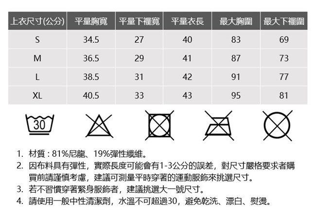 材質 : 81%尼龍、19%彈性纖維。