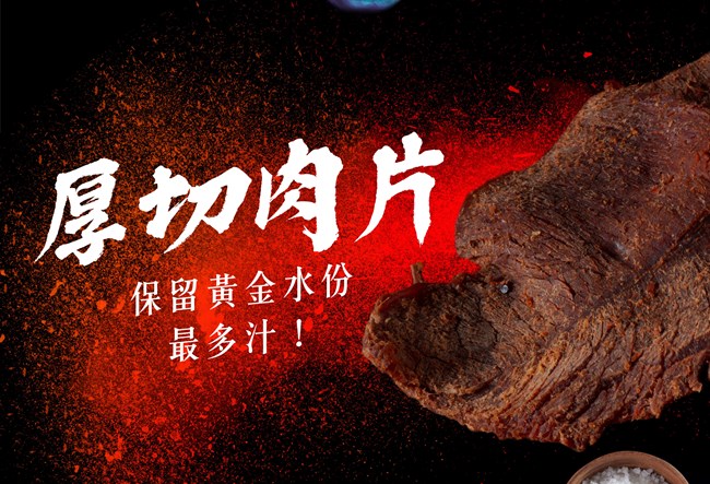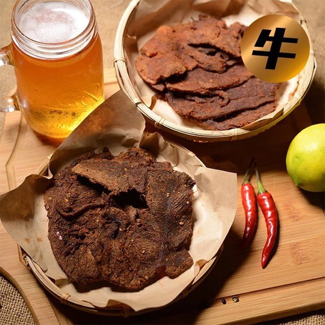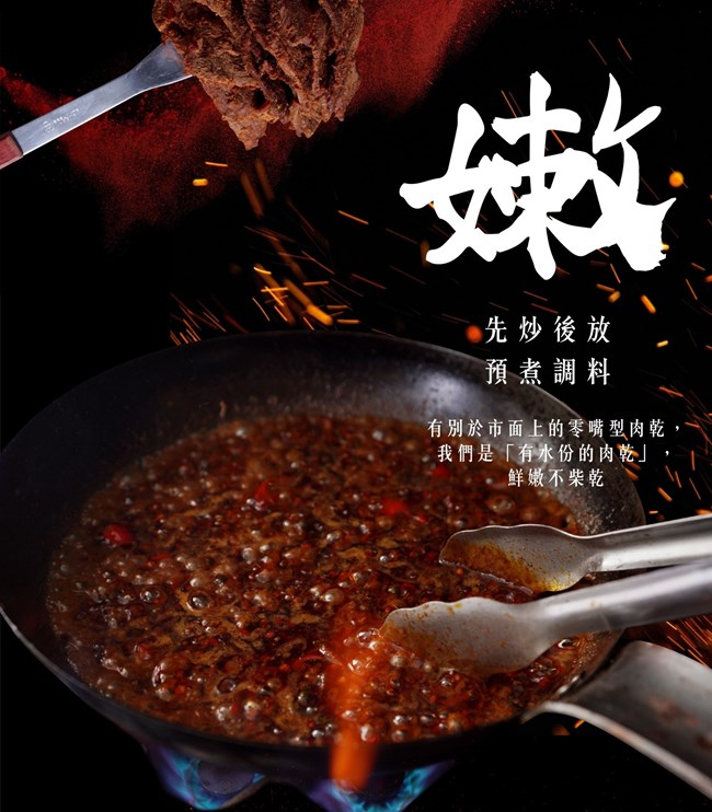 ▲嫩!先炒後放預煮調料,有别於市面上的零嘴型肉乾,厚切肉片保留黃金水份最多汁!是「有水份的肉乾」,鮮嫩絕不柴乾。