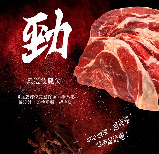 ▲勁!牛肉嚴選後腿筋部位完整保留,專為老饕設計,咀嚼超有口感,越吃越辣,越嚼越過癮!越有勁!