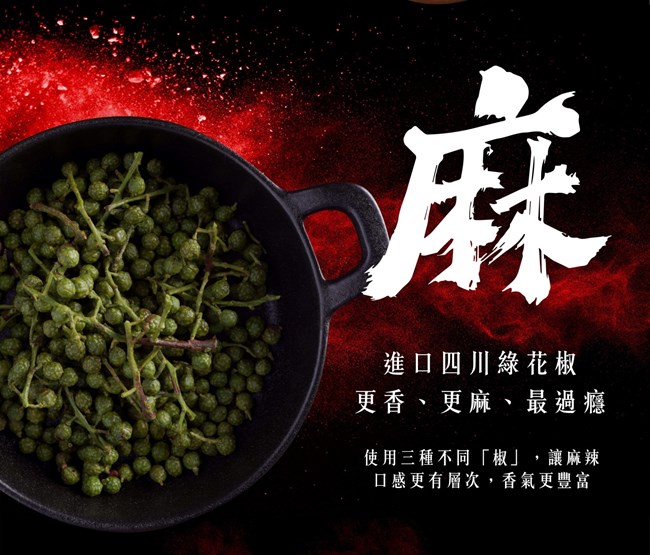 ▲麻!進口四川綠花椒,更香、更麻、更過癮。使用三種不同「椒」,香麻辣舌不傷喉胃,相比市面上的麻辣口味,更多的香氣與回甘。