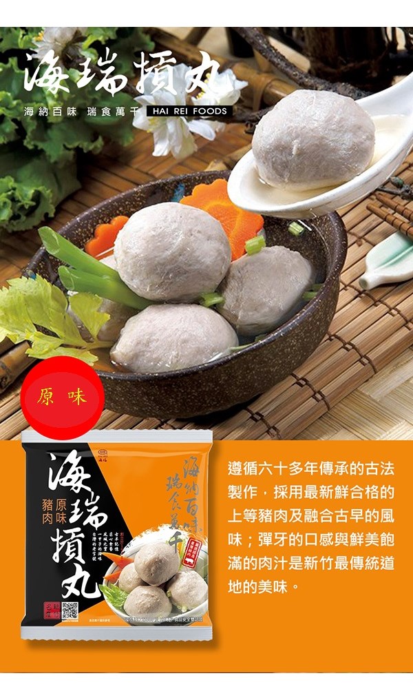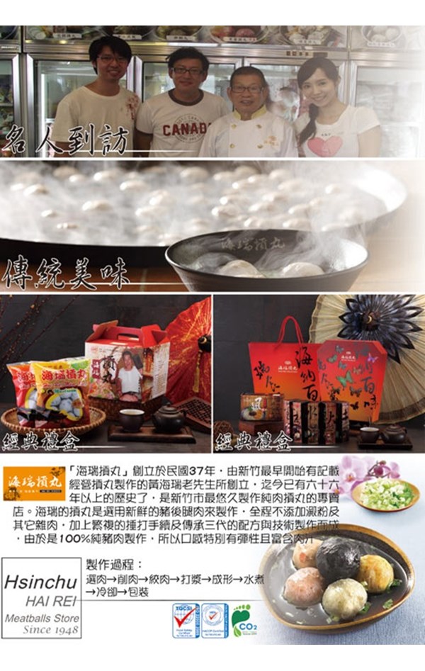 「海瑞摃丸」創立於民國三十七年,也是新竹最早開始記載經營摃丸製作的黃海瑞先生所創立,傳承三代迄今已有七十年以上的歷史,海瑞的摃丸是選用新鮮的豬後腿肉來製作,加上繁複的捶打手續及傳承三代的配方與技術製作而成,由於是100%純豬肉製作,所以口感特別有彈性且富含肉汁,連續獲得五屆新竹十大伴手禮獎項,成為台灣家喻戶曉的必買伴手禮。