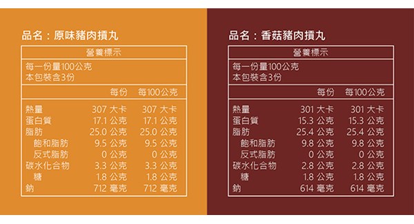 原味豬肉摃丸:豬肉(台灣)、食鹽、砂糖、調味劑(L-麩酸鈉)、品質改良劑(焦磷酸鈉、偏磷酸鉀、多磷酸鈉)。