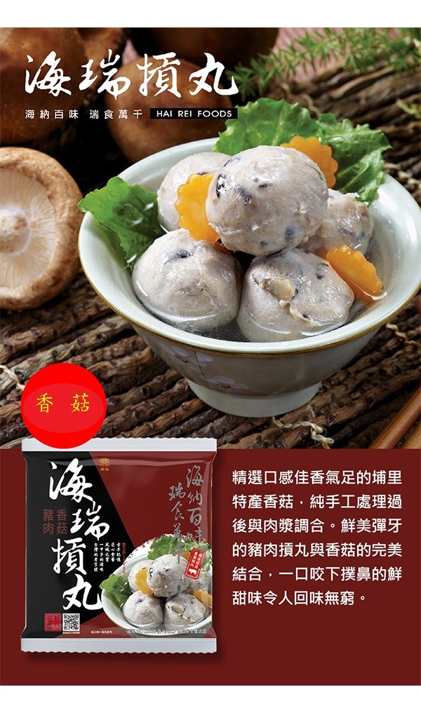精選口感佳香氣足的埔里特產香菇,純手工處理過後與肉漿調合。鮮美彈牙的豬肉摃丸與香菇的完美結合,一口咬下撲鼻的鮮甜味令人回味無窮。